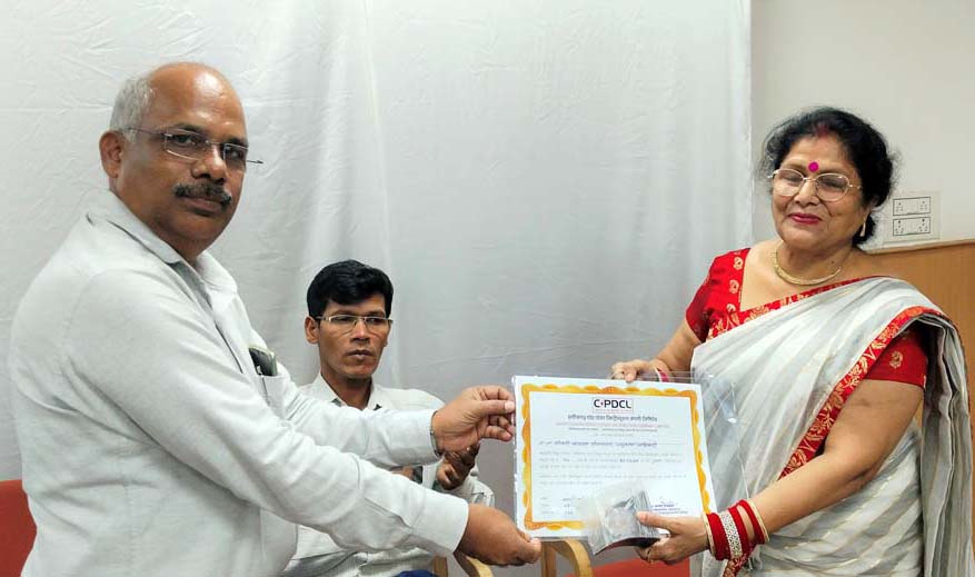 राजनांदगांव- छत्तीसगढ़ स्टेट पॉवर डिस्ट्रीब्यूशन कंपनी लिमिटेड राजनांदगांव क्षेत्र के वरिष्ठ लेखाधिकारी कार्यालय में पदस्थ अनुभाग अधिकारी कल्पना श्रीवास्तव के सेवानिवृत्ति पर अधिकारियों एवं कर्मचारियों ने पार्रीनाला स्थित क्षेत्रीय प्रशासनिक भवन में सम्मान समारोह आयोजित कर भावभीनी विदाई दी. श्रीमती श्रीवास्तव ने मध्यप्रदेश विद्युत मंडल, छत्तीसगढ़ राज्य विद्युत मंडल एवं सीएसपीडीसीएल में 40 वर्षो तक अपनी सेवाएं दी. उन्हें राजनांदगांव क्षेत्र के मुख्य अभियंता टी. के. मेश्राम ने स्मृति चिन्ह, उपहार एवं प्रमाण पत्र देकर सम्मानित किया.