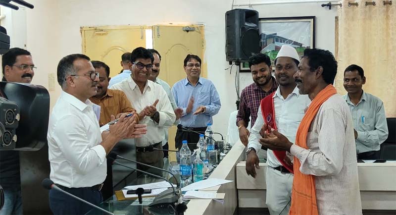अम्बिकापुर – कलेक्टर सरगुजा विलास भोसकर की अध्यक्षता में प्रति मंगलवार समयसीमा के बैठक के बाद कलेक्टर जनदर्शन आयोजित किया जाता है. कलेक्टर जनदर्शन में फरियादी अपने आवेदन लेकर पहुंचते हैं जिनके निराकरण के लिए कलेक्टर द्वारा संबंधित अधिकारियों को निर्देशित किया जाता है. आज मंगलवार को हमेशा की तरह जनदर्शन चल रहा था और आवेदन लिए जा रहे थे. इसी बीच लखनपुर विकासखंड के ईरगवां गांव से आवेदक पंडित दास अपना आवेदन लेकर पहुंचे थे. कलेक्टर ने आवेदक का आवेदन लिया और जब आवदेक के हस्ताक्षर की जगह अंगूठे की छाप देखी, तो उन्होंने पंडित दास से उनकी शिक्षा की जानकारी ली. आवेदक ने बताया कि वे पढ़े लिखे नहीं है, इसलिए अंगूठा लगाते हैं. इस पर कलेक्टर ने उन्हें शासन के उल्लास नवभारत साक्षरता कार्यक्रम के बारे में बताया और पढ़ना लिखना सीखने की अपील की. कलेक्टर ने उन्हें अपना नाम लिखना सीखना के लिए प्रेरित किया जिसका असर हुआ कि जनदर्शन खत्म होने से पहले ही पंडित दास अपना नाम लिखना सीख गए. उन्होंने साक्षरता अभियान के तहत साक्षरता कार्यालय में कर्मचारियों की मदद से अपना नाम लिखना सीखा और आखिर में अंगूठा लगाने की बजाय कलेक्टर के समक्ष धीरे-धीरे हस्ताक्षर करके पुनः अपना आवेदन प्रस्तुत किया.