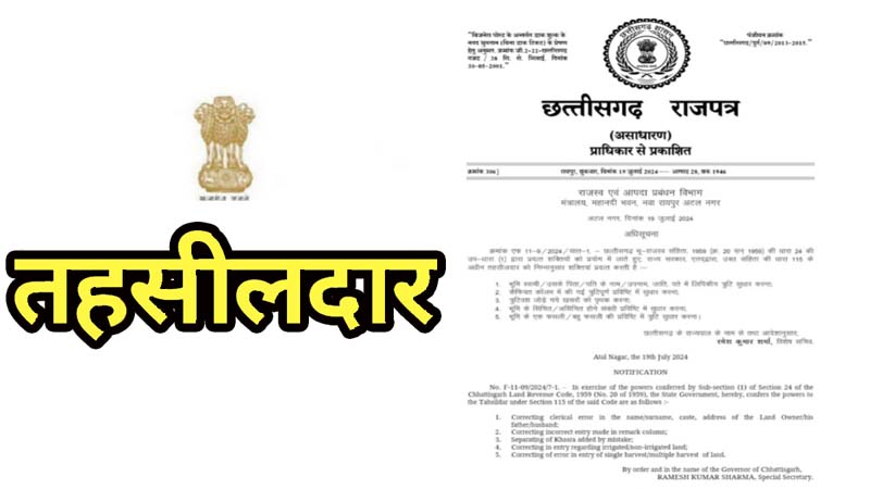 मुख्यमंत्री विष्णु देव साय की मंशानुरूप राजस्व रिकार्ड में त्रुटि सुधार के अभ्यावेदन पर त्वरित कार्यवाही की जाएगी और इसके लिए तहसीलदारों को जिम्मेदारी सौंपी गई है. छत्तीसगढ़ राज पत्र में प्रकाशित अधिसूचना के अनुसार विशेष सचिव राजस्व एवं आपदा प्रबंधन ने छत्तीसगढ़ भू-राजस्व संहिता, 1959 (क्र. 20 सन् 1959) की धारा 24 की उप-धारा (1) द्वारा प्रदत्त शक्तियों को प्रयोग में लाते हुए, राज्य सरकार द्वारा उक्त संहिता की धारा 115 के अधीन तहसीलदार को भूमि स्वामी उसके पिता, पति के नाम, उपनाम, जाति, पते में लिपिकीय त्रुटि सुधार करने अधिकृत किया गया है. इसी प्रकार राजस्व रिकार्ड में कैफियत कॉलम में की गई त्रुटिपूर्ण प्रविष्टि में सुधार करना, त्रुटिवश जोड़े गये खसरों को पृथक करना, भूमि के सिंचित, असिंचित होने संबंधी प्रविष्टि में सुधार करना, भूमि के एक फसली तथा बहु फसली की प्रविष्टि में त्रुटि सुधार करने के लिए तहसीलदार को अधिकृत किया गया है.