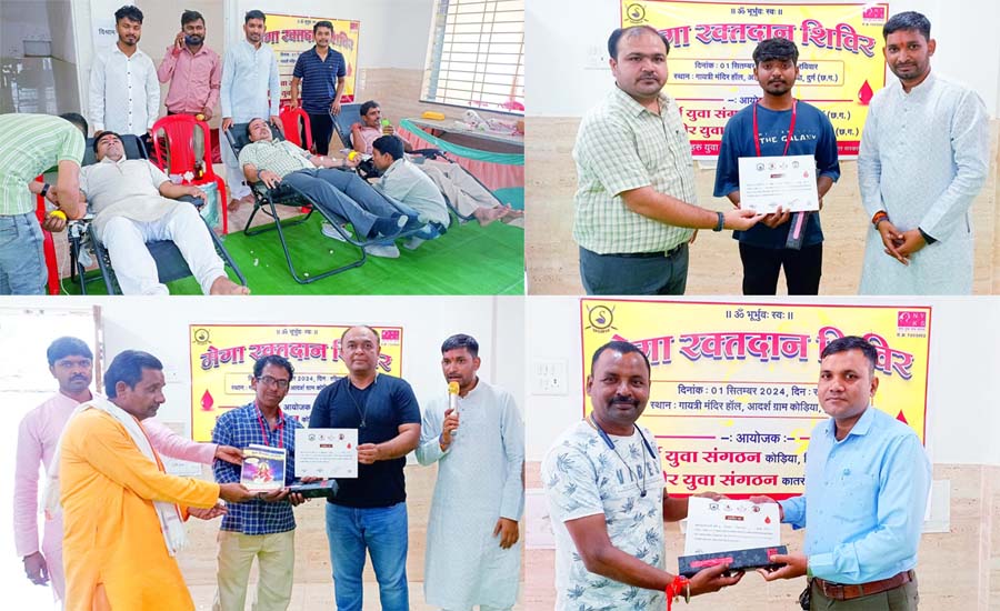 उतई/दुर्ग- शौर्य युवा संगठन कोड़िया के सचिव आदित्य भारद्वाज एवं कर्मवीर युवा संगठन कातरो के संस्थापक जितेंद्र सोनी के जन्मदिन के उपलक्ष्य पर गायत्री मन्दिर हॉल कोड़िया में मेगा रक्तदान एवं निःशुल्क स्वास्थ्य जांच शिविर का आयोजन किया गया था जिसमें लगभग 20 नए रक्तदाताओं सहित 46 युवाओं ने रक्तदान किया.
