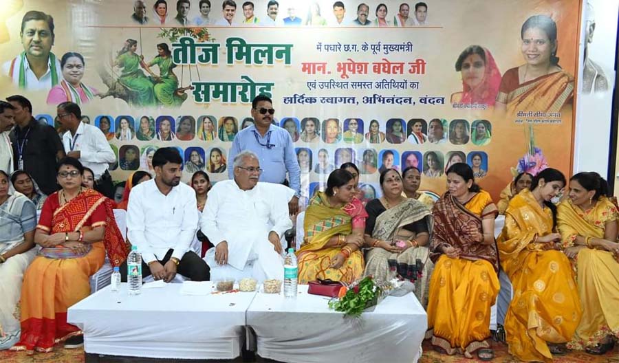 कार्यक्रम के मुख्य अतिथि पूर्व मुख्यमंत्री बघेल द्वारा तीज मिलन मिलन में उपस्थित महिलाओं को बधाई व शुभकामनाएं प्रेषित करते हुए कहा की आज महिलाएं हर क्षेत्र में सशक्त भूमिका निभा रही हैं आगे भी आर्थिक व शैक्षणिक रूप से सशक्त होनी कि ज़रूरत है. उन्होंने कहा की वर्तमान भाजपा सरकार के आठ महीने के कार्यकाल में महिलाओं पर हो रहे अन्याय अत्याचार, बलात्कार, रेप, लूट, हत्या जैसे जघन्य घटना लगातार बढ़ी है. निरंकुश भाजपा की सरकार क़ानून व्यवस्था के क्षेत्र में नाकाम रही है.
