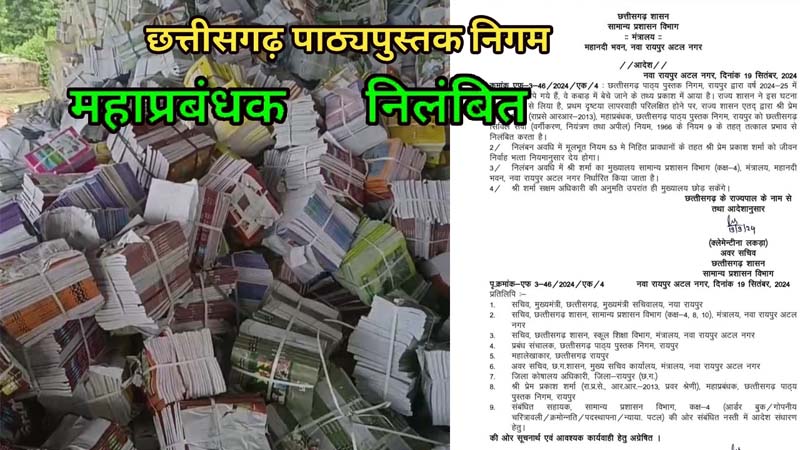 छत्तीसगढ़ पाठ्य पुस्तक निगम, रायपुर द्वारा वर्ष 2024-25 में जो पुस्तकें छापे गये हैं, वे कबाड़ में बेचे जाने के तथ्य प्रकाश में आया है. राज्य शासन ने इस घटना को गंभीरता से लिया है, प्रथम दृष्टया लापरवाही परिलक्षित होने पर, राज्य शासन एतद् द्वारा प्रेम प्रकाश शर्मा, (राप्रसे आरआर-2013), महाप्रबंधक, छत्तीसगढ़ पाठ्य पुस्तक निगम, रायपुर को छत्तीसगढ़ सिविल सेवा (वर्गीकरण, नियंत्रण तथा अपील) नियम, 1966 के नियम 9 के तहत् तत्काल प्रभाव से निलंबित किया है. निलंबन अवधि में मूलभूत नियम 53 में निहित प्रावधानों के तहत प्रेम प्रकाश शर्मा को जीवन निर्वाह भत्ता नियमानुसार देय होगा. निलंबन अवधि में श्री शर्मा का मुख्यालय सामान्य प्रशासन विभाग (कक्ष-4), मंत्रालय, महानदी भवन, नवा रायपुर अटल नगर निर्धारित किया है.