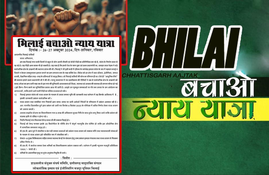 भिलाई बचाओ न्याय यात्रा: 26 व 27 अक्टूबर को, नगर की विभिन्न समस्याओं को लेकर निकालेगी यात्रा