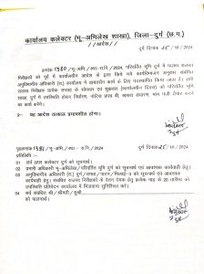 दुर्ग- परिवर्तित भूमि शाखा में पदस्थ राजस्व निरीक्षकों को पूर्व में कार्यालयीन आदेश के द्वारा किये गये कार्य विभाजन अनुसार दुर्ग,पाटन, धमधा और भिलाई-3 संबंधित अनुविभागीय अधिकारी (रा.) कार्यालय में डायवर्सन कार्य के लिए पदस्थापित किया गया है. सभी राजस्व निरीक्षक प्रत्येक सप्ताह के सोमवार एवं शुकवार (कार्यालयीन दिवस) को परिवर्तित भूमि शाखा, दुर्ग में उपस्थिति होकर निर्धारण, नोटिस प्रपत्र बी, खसरा संधारण, मांग पंजी तैयार करने का कार्य करेंगे और बाकी दिन अनुविभागीय अधिकारी राजस्व में कार्य करेंगे. जारी आदेश में कहा गया है कि संबंधित राजस्व निरीक्षकों के वेतन देयक हेतु प्रत्येक माह के 20 तारीख को उपस्थिति प्रतिवेदन जिला कार्यालय में भेजेंगे.