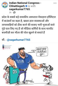 रायपुर- रायपुर के सरकारी अस्पताल मेकाहारा में पत्रकारों के साथ मारपीट मामले में कांग्रेस ने सोशल मीडिया में पोस्टर जारी कर सरकार पर निशाना साधा है. कांग्रेस ने कहा, अस्पताल की पोल खुलने से बचाने गुंडों को तैनात किया गया है.