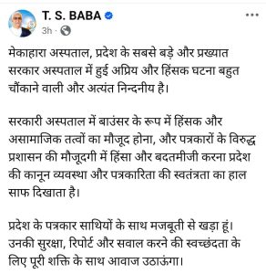 वहीं प्रदेश के पूर्व उपमुख्यमंत्री टीएस सिंहदेव ने सोशल मीडिया पर पोस्ट कर इस घटना की निंदा की है. उन्होंने कहा, प्रदेश के सबसे बड़े और प्रख्यात सरकारी अस्पताल मेकाहारा में हुई अप्रिय और हिंसक घटना बहुत चौंकाने वाली और अत्यंत निन्दनीय है। सरकारी अस्पताल में बाउंसर के रूप में हिंसक और असामाजिक तत्वों का मौजूद होना और पत्रकारों के विरुद्ध प्रशासन की मौजूदगी में हिंसा और बदतमीजी करना प्रदेश की कानून व्यवस्था और पत्रकारिता की स्वतंत्रता का हाल साफ दिखाता है। सिंहदेव ने कहा, मैं प्रदेश के पत्रकार साथियों के साथ मजबूती से खड़ा हूं. उनकी सुरक्षा, रिपोर्ट और सवाल करने की स्वच्छंदता के लिए पूरी शक्ति के साथ आवाज उठाऊंगा.