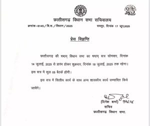 छत्तीसगढ़ विधानसभा के मानसून सत्र की अधिसूचना जारी, 14 जुलाई से शुरू होगा सत्र Chhattisgarh Aajtak June 17, 2025 विधानसभा के मानसून सत्र की अधिसूचना जारी, 14 जुलाई से शुरू होगा सत्र रायपुर- विधानसभा के मॉनसून सत्र के लिए अधिसूचना जारी कर दी गई है. 14 से 18 जुलाई तक चलने वाले सत्र में केवल 5 बैठकें होंगी, जिनमें वित्तीय और विधि विधायी कार्यों का निष्पादन होगा. Post navigation Previous वीर शहीद आकाश राव गिरपुंजे को दी गई श्रद्धांजलिNext राजस्व प्रकरणों का समय-सीमा में निराकरण नहीं करने वाले अधिकारियों पर होगी अनुशासनात्मक कार्यवाही: राजस्व मंत्री Related Stories छत्तीसगढ़ कांग्रेस के 4 नेताओं को मिली बड़ी जिम्मेदारी, UP और नागालैंड में संगठन सृजन अभियान के बने पर्यवेक्षक छत्तीसगढ़ राजनीति राष्ट्रीय छत्तीसगढ़ कांग्रेस के 4 नेताओं को मिली बड़ी जिम्मेदारी, UP और नागालैंड में संगठन सृजन अभियान के बने पर्यवेक्षक January 25, 2026 रायपुर साहित्य उत्सव: सुरेंद्र दुबे मंडप में चित्रकला प्रदर्शनी बनी आकर्षण का केंद्र छत्तीसगढ़ साहित्य रायपुर साहित्य उत्सव: सुरेंद्र दुबे मंडप में चित्रकला प्रदर्शनी बनी आकर्षण का केंद्र January 25, 2026 जहाँ से कहानियाँ उठती हैं, वहीं से सिनेमा को रास्ता मिलता है छत्तीसगढ़ जहाँ से कहानियाँ उठती हैं, वहीं से सिनेमा को रास्ता मिलता है January 25, 2026