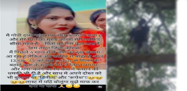 जांजगरीर-चाम्पा जिले के बलौदा थाना क्षेत्र के पोंच गांव का एक युवक ने इंस्टाग्राम पर पोस्ट करने के बाद फांसी लगाकर मौत को गले लगा लिया. मरने से पहले युवक ने इंस्टाग्राम पर पोस्ट की मुख्य वजह उसकी गर्लफ्रेंड है. मृतक की पहचान गोपी दास महंत के रूप में हुई है. घटना की सूचना मिलने पर बलौदा पुलिस ने मौके पर पहुंचकर शव को उतारकर पंचनामा कर पोस्टमार्टम के लिए भेजा. युवक के आत्महत्या करने के बाद उसके इंस्टाग्राम पोस्ट सामने आया, जिसमें उसने अपनी मौत के पीछे अपनी प्रेमिका को जिम्मेदार ठहराया. युवक ने बताया कि बीते चार साल से युवती उसे प्रताड़ित कर रही है. युवक ने बताया कि 13 जून को प्रेमिका ने मिलने के बहाने रायपुर बुलाकर 15 हजार रुपए लिए, मना करने पर रेप के मामले में फंसाने की धमकी भी दी. आखिर में युवक ने अपने माता-पिता से माफी मांगी है.