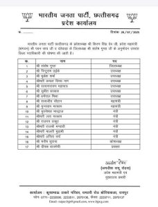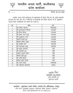 राजनीति छत्तीसगढ़ भाजपा ने इन तीन जिलों में की नई कार्यकारिणी का ऐलान Chhattisgarh Aajtak July 29, 2025 छत्तीसगढ़ भाजपा ने इन तीन जिलों में की नई कार्यकारिणी का ऐलान रायपुर- छत्तीसगढ़ भाजपा ने 3 जिलों में नई कार्यकारिणी का ऐलान कर दिया है. जिन जिलों की कार्यकारिणी गठित की गयी है, उसमें बालोद, दंतेवाड़ा और गरियाबंद जिला शामिल हैं. देखें लिस्ट- Post navigation Previous संगठन की मजबूती हमारा मूल उद्देश्यः अनिलाNext स्कूलों के होंगे मरम्मत, शौचालय निर्माण और बुनियादी सुविधाओं का विस्तार Related Stories छत्तीसगढ़ कांग्रेस के 4 नेताओं को मिली बड़ी जिम्मेदारी, UP और नागालैंड में संगठन सृजन अभियान के बने पर्यवेक्षक छत्तीसगढ़ राजनीति राष्ट्रीय छत्तीसगढ़ कांग्रेस के 4 नेताओं को मिली बड़ी जिम्मेदारी, UP और नागालैंड में संगठन सृजन अभियान के बने पर्यवेक्षक January 25, 2026 केंद्रीय बजट : बीजेपी ने 6 सदस्यीय प्रदेश स्तरीय समिति का किया गठन छत्तीसगढ़ राजनीति केंद्रीय बजट : बीजेपी ने 6 सदस्यीय प्रदेश स्तरीय समिति का किया गठन January 25, 2026 बेलतरा में 100 रूपये प्रति वर्गफुट वसूली का आरोप, कार्यप्रणाली पर उठे गंभीर सवाल राजनीति बेलतरा में 100 रूपये प्रति वर्गफुट वसूली का आरोप, कार्यप्रणाली पर उठे गंभीर सवाल January 24, 2026