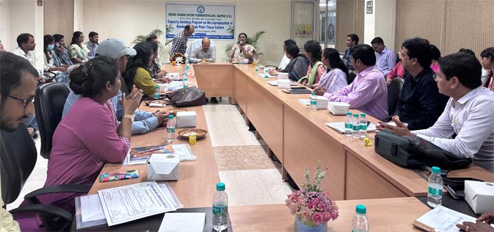 कार्यक्रम युवा शोधकर्ताओं, तकनीकी कर्मचारियों और स्नातकोत्तर छात्रों के बीच बाँस सूक्ष्मप्रजनन की व्यावहारिक दक्षता और वैज्ञानिक समझ को बढ़ाने हेतु डिज़ाइन किया गया था. कुल 20 प्रतिभागियों ने प्रशिक्षण में भाग लिया, जिनमें आईजीकेवी के विभिन्न केंद्रों से 12 वैज्ञानिक और तकनीशियन तथा विभाग के आठ छात्र शामिल थे. समापन सत्र का आरंभ अतिथियों के स्वागत के साथ हुआ, इसके बाद आयोजन सचिव डॉ. ज़ेनू झा द्वारा प्रशिक्षण का विस्तृत प्रतिवेदन प्रस्तुत किया गया. उन्होंने सत्रवार गतिविधियों, प्रतिभागियों की सहभागिता और प्रमुख उपलब्धियों को रेखांकित किया. रिपोर्ट में पाँच दिनों के संरचित शिक्षण की झलक दी गई जिसमें एक्सप्लांट की तैयारी, शूट मल्टीप्लिकेशन, रूटिंग तकनीक, और अनुकूलन प्रोटोकॉल से लेकर संदूषण प्रबंधन और आणविक नैदानिक सत्रों तक का समावेश था. प्रतिभागियों ने प्रशिक्षण को लेकर सकारात्मक फीडबैक साझा किया और विशेष रूप से डॉ. श्याम सुंदर शर्मा, टेरी (नई दिल्ली) द्वारा वाणिज्यिक सूक्ष्मप्रजनन पर आयोजित सत्र को प्रशिक्षण का मुख्य आकर्षण बताया.