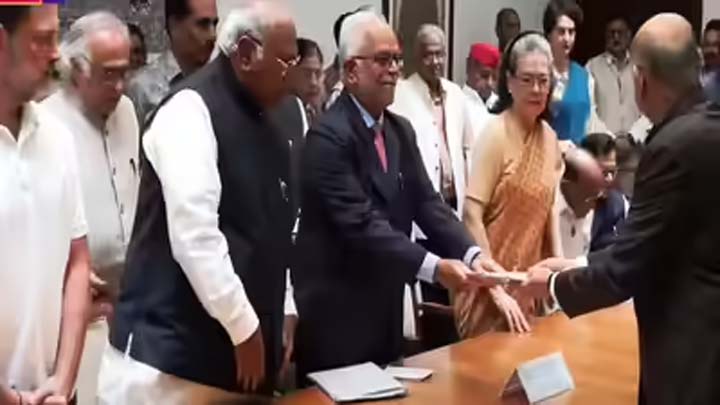 बी सुदर्शन रेड्डी के नामांकन के दौरान उनके साथ कांग्रेस सांसद राहुल गांधी, कांग्रेस के राष्ट्रीय अध्यक्ष मल्लिकार्जुन खरगे समेत कई विपक्षी नेता मौजूद रहे.