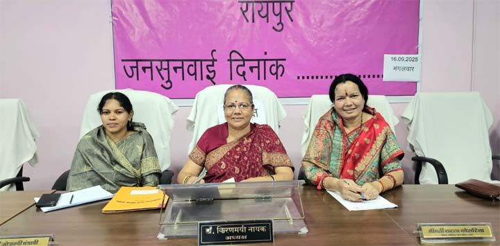 रायपुर- छत्तीसगढ़ राज्य महिला आयोग की अध्यक्ष डाॅ. किरणमयी नायक, सदस्यगण सरला कोसरिया, ओजस्वी मंडावी ने 16 सितंबर को छत्तीसगढ़ राज्य महिला आयोग के कार्यालय रायपुर में महिला उत्पीड़न से संबंधित प्रकरणों पर सुनवाई की. आयोग की अध्यक्ष डाॅ. किरणमयी नायक की अध्यक्षता में प्रदेश स्तर पर 345 वी. एवं रायपुर जिले में 164 वी. जनसुनवाई की गई.
