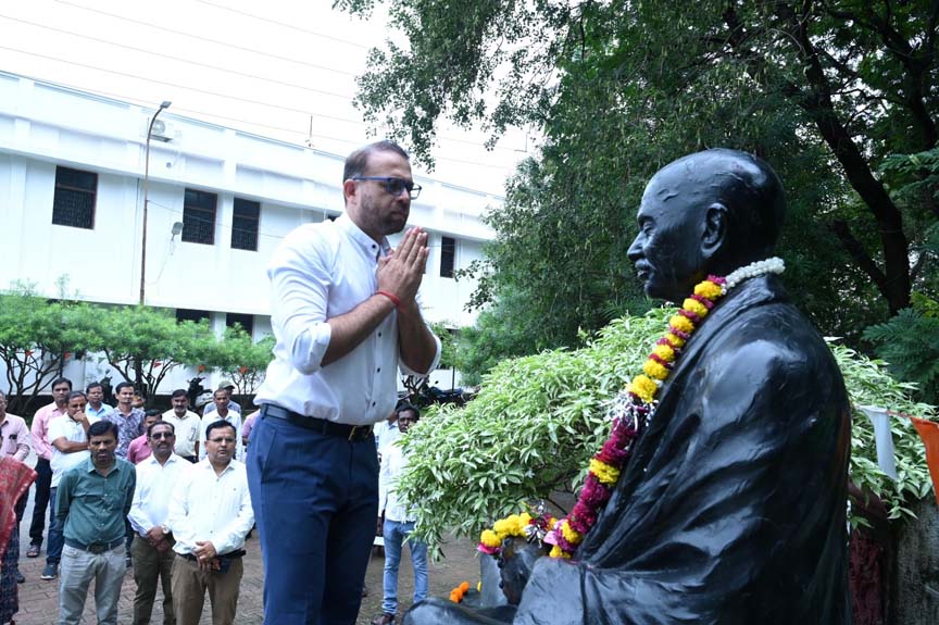 राजनांदगांव – कलेक्टर डॉ. सर्वेश्वर नरेन्द्र भुरे ने राष्ट्रपिता महात्मा गांधी जयंती के अवसर पर आज कलेक्टोरेट परिसर स्थित गांधी प्रतिमा पर माल्यार्पण कर उन्हें नमन किया. इस अवसर पर गांधी जी के प्रिय भजन वैष्णव जनतो …, रघुपति राघव राजाराम का गायन किया गया. इस दौरान कलेक्टर ने अधिकारी-कर्मचारियों को नशा मुक्ति के लिए संकल्प दिलाया.