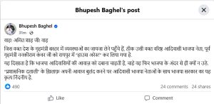 छत्तीसगढ़ के पूर्व मुख्यमंत्री भूपेश बघेल ने अपने सोशल फेसबुक मीडिया पर पोस्ट कर कहा कि वाह! अमित शाह जी! वाह जिस वक्त देश के गृहमंत्री बस्तर में व्यवस्थाओं का जायजा लेने पहुँचे हैं, ठीक उसी वक्त वरिष्ठ आदिवासी भाजपा नेता, पूर्व गृहमंत्री ननकीराम कंवर जी को रायपुर में “हाउस अरेस्ट” कर लिया गया है.