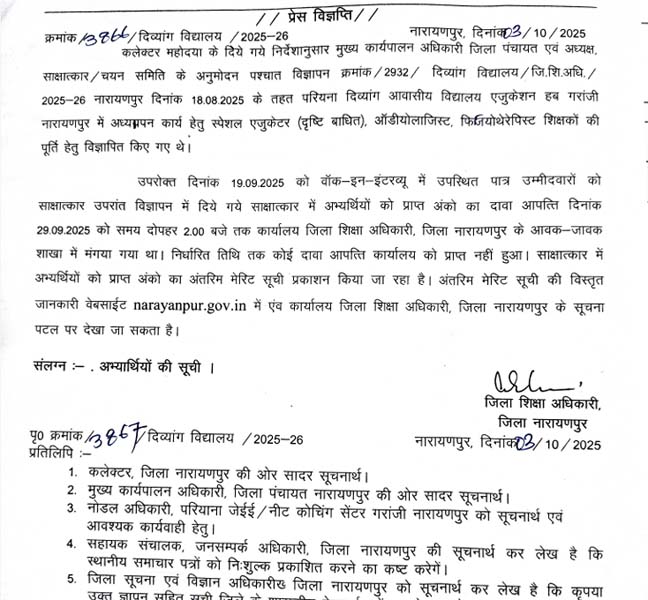 नारायणपुर- परियना दिव्यांग आवासीय विद्यालय एजुकेशन हब गराजी नारायणपुर में अध्यापन कार्य हेतु स्पेशल एजुकेटर (दृष्टि बाधित), ऑडीयोलाजिस्ट, फिजियोथेरेपिस्ट शिक्षकों की पूर्ति हेतु विज्ञापित किए गए थे. 19 सितम्बर को वॉक-इन-इंटरव्यू में उपस्थित पात्र उम्मीदवारों को साक्षात्कार उपरांत विज्ञापन में दिये गये साक्षात्कार में अभ्यर्थियों को प्राप्त अंको का दावा आपत्ति 29 सितम्बर को समय दोपहर 2.00 बजे तक कार्यालय जिला शिक्षा अधिकारी नारायणपुर के आवक-जावक शाखा में मंगया गया था. निर्धारित तिथि तक कोई दावा आपत्ति कार्यालय को प्राप्त नहीं हुआ. साक्षात्कार में अभ्यर्थियों को प्राप्त अंको का अंतरिम मेरिट सूची प्रकाशन किया गया है. अंतरिम मेरिट सूची की विस्तृत जानकारी वेबसाईट https://narayanpur.gov.in/ में एंव कार्यालय जिला शिक्षा अधिकारी, जिला नारायणपुर के सूचना पटल पर देखा जा सकता है.