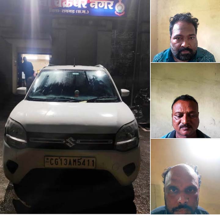रायगढ़- पुलिस अधीक्षक दिव्यांग कुमार पटेल के दिशा-निर्देशन पर जिले में मादक पदार्थों की तस्करी पर सख्त निगरानी रखी जा रही है. इसी कड़ी में सोमवार को चक्रधरनगर पुलिस और साइबर सेल की संयुक्त कार्रवाई में तीन गांजा तस्करों को वैगनआर कार सहित गिरफ्तार किया गया है. आरोपियों के पास से नकदी रकम 2000 रूपये तथा 1.152 किलोग्राम गांजा बरामद किया गया है, जिसकी कीमत लगभग 5,500 रुपये है. तीनों आरोपियों पर एनडीपीएस एक्ट की धाराओं के तहत गिरफ्तार कर रिमांड पर भेजा गया है.