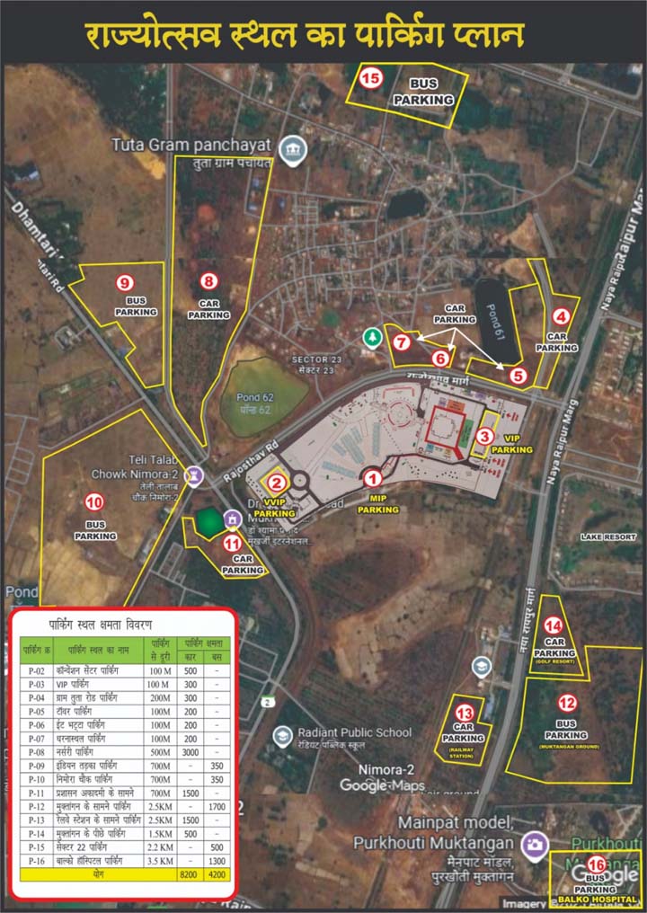 दोपहिया वाहनों की पार्किंग राज्योत्सव स्थल के सामने धरना स्थल के दोनों तरफ स्थित पार्किंग स्थल पी-05, पी-06 एवं पी-07 में होगी.