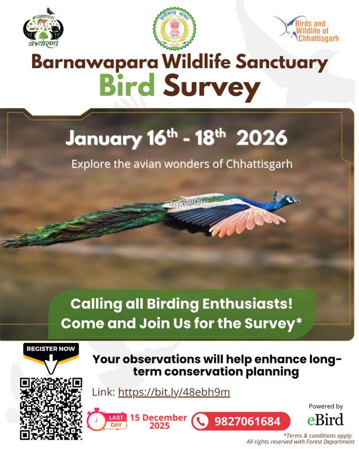 सर्वे के लिए पंजीकरण की अंतिम तिथि 15 दिसंबर 2025 निर्धारित है. इच्छुक प्रतिभागी लिंक या फ्लायर पर दिए गए QR कोड के माध्यम से आवेदन कर सकते हैं. यह आयोजन Birds & Wildlife of Chhattisgarh के सहयोग से तथा eBird के तकनीकी समर्थन के साथ किया जा रहा है, जिससे प्रतिभागियों द्वारा जुटाई गई जानकारी वैश्विक डाटाबेस में शामिल होगी.