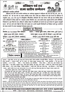 दुर्ग- भारतीय संविधान के 75 वर्ष पूर्ण होने पर अखिल भारतीय एस.सी, एसटी, ओबीसी संयुक्त मोर्चा छत्तीसगढ़ द्वारा संविधान पर्व एवं राज्य स्तरीय सम्मेलन का कार्यक्रम मनवा कुर्मी भवन शंकर दुर्ग में 21 दिसंबर 2025 दिन रविवार को रखा गया गया है. कार्यक्रम प्रारंभ सुबह 10 बजे किया जाएगा. कार्यक्रम के दौरान शाहू जी महाराज समता सम्मान, बाबा गुरु घासीदास समता सम्मान और ज्योतिबा फुले शिक्षा सम्मान प्रदान किए जाएंगे. सामाजिक, शैक्षणिक एवं प्रशासनिक क्षेत्रों में उल्लेखनीय योगदान देने वाले व्यक्तियों को विशेष रूप से सम्मानित किया जाएगा. प्रदेश अध्यक्ष इंजीनियर कौशल वर्मा एवं संयुक्त मोर्चा के समस्त पदाधिकारियों ने प्रदेशभर के नागरिकों से अपील की है कि वे अधिक से अधिक संख्या में सम्मेलन में भाग लेकर संविधान की रक्षा और सामाजिक एकता के इस आंदोलन को मजबूती प्रदान करें.