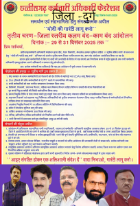छत्तीसगढ़ कर्मचारी – अधिकारी फेडरेसन एवं फेडरेसन से संबद्ध संगठनों के सभी पदाधिकारीगण अपने विभागीय कर्मचारी साथियो सहित अधिक से अधिक संख्या में 29,30,31 दिसंबंर-2025 को तीन दिवसीय निश्चितकालीन काम-बंद, कलम बंद हड़ताल में आने का आग्रह किया है. धरना स्थल शासकीय बहुउद्देशीय उच्चतर माध्यमिक शाला दुर्ग (झाडूराम देवांगन स्कूल जी.ई.रोड दुर्ग) के सामने में होगा.