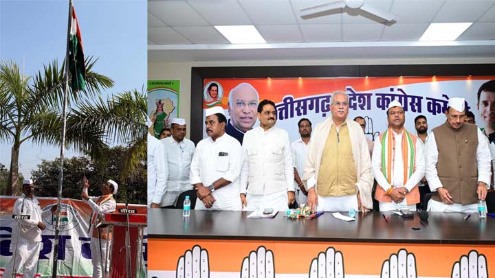 रायपुर- कांग्रेस का 141 वां स्थापना दिवस प्रदेश कांग्रेस मुख्यालय राजीव भवन में मनाया गया. इस अवसर पर प्रदेश कांग्रेस अध्यक्ष दीपक बैज ने राजीव भवन में पार्टी के ध्वजारोहण किया तथा सेवादल के साथियों ने सलामी दिया. ध्वजारोहण के आजादी की लड़ाई से लेकर देश के नवनिर्माण तक कांग्रेस विषय पर संगोष्ठी का आयोजन किया गया. संगोष्ठी में प्रदेश कांग्रेस अध्यक्ष दीपक बैज, पूर्व मुख्यमंत्री भूपेश बघेल, वरिष्ठ नेता सत्यनारायण शर्मा, राजेन्द्र तिवारी ने अपने कांग्रेस के इतिहास पर प्रकाश डाला. कार्यक्रम में स्वागत भाषण शहर अध्यक्ष श्रीकुमार मेनन, आभार ग्रामीण अध्यक्ष राजेन्द्र पप्पू बंजारे एवं संचालन महामंत्री सुबोध हरितवाल ने किया.