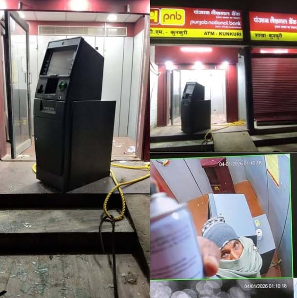 जानकारी के अनुसार, रात्रि 01:00 से 02:00 बजे के मध्य कुनकुरी स्थित PNB ATM बूथ में अज्ञात आरोपियों द्वारा ATM मशीन को रस्सी से बांधकर पिकअप वाहन से खींचते हुए उखाड़ा गया. पुलिस टीम द्वारा पीछा किए जाने पर आरोपियों ने पिकअप वाहन में पहले से रखे पत्थरों से पुलिस वाहन पर हमला किया, जिससे पुलिस वाहन का शीशा क्षतिग्रस्त हुआ. घटना के बाद आरोपी पिकअप वाहन से फरार होकर तपकरा की ओर भागे, कुंजारा जंगल के पास पिकअप वाहन को छोड़कर भागे, पिकअप का नम्बर JH 07 E 9167. आरोपियों द्वारा छोड़े गए वाहन एवं घटना स्थल के CCTV फुटेज खंगाले जा रहे हैं. मामले की गंभीरता को देखते हुए अलग-अलग टीमों का गठन कर आरोपियों की तलाश की जा रही है.