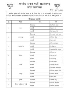 रायपुर- भारतीय जनता पार्टी के अल्पसंख्यक मोर्चा, अनुसूचित जाति (अजा) मोर्चा और युवा मोर्चा में जिला अध्यक्षों और महामंत्रियों की नियुक्तियां की गई है. यह नियुक्तियां पार्टी के प्रदेश अध्यक्ष किरण सिंह देव की सहमति से की गई है. जारी लिस्ट में अल्पसंख्यक मोर्चा के 9 जिला अध्यक्ष, अनुसूचित जाति मोर्चा के 5 जिला अध्यक्षों और युवा मोर्चा में 13 जिला अध्यक्षों के साथ महामंत्रियों को नियुक्त किया गया है.