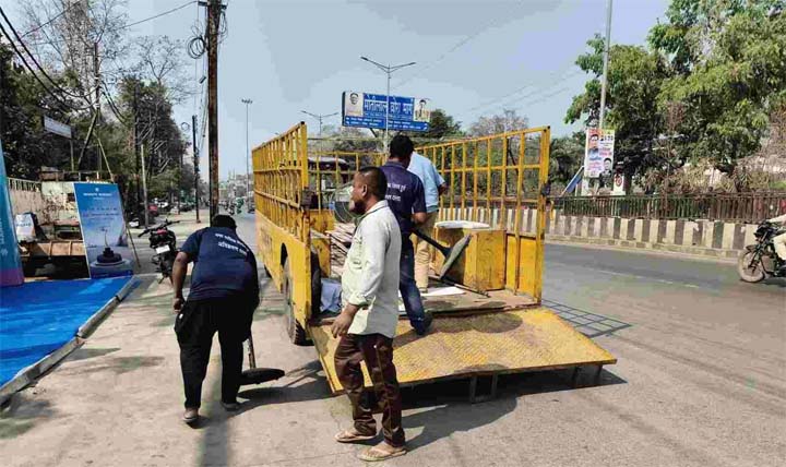 दुर्ग- नगर पालिक निगम दुर्ग अंतर्गत जे.आर.डी. स्कूल के समीप सड़क पर कम्पनी मारुति सुज़ुकी द्वारा अवैध रूप से टेंट लगाकर आवागमन बाधित किए जाने का मामला सामने आया. गुरूवार सुबह कार्यालय जाते समय कलेक्टर अभिजीत सिंह की नजर इस अतिक्रमण पर पड़ी, जिस पर उन्होंने तत्काल नगर निगम आयुक्त को आवश्यक कार्रवाई के निर्देश दिए. कलेक्टर के निर्देश के परिपालन में आयुक्त सुमित अग्रवाल के मार्गदर्शन में निगम की अतिक्रमण टीम मौके पर पहुँची और त्वरित कार्रवाई करते हुए सड़क किनारे लगाए गए टेंट, ढांचा एवं अन्य सामग्री को जब्त कर लिया. कार्रवाई के दौरान मार्ग को पूर्णतः अवरोध मुक्त कराया गया, जिससे आम नागरिकों को सुगम आवागमन की सुविधा पुनः उपलब्ध हो सकी. नगर निगम प्रशासन ने स्पष्ट किया है कि शहर में किसी भी प्रकार का अवैध अतिक्रमण बर्दाश्त नहीं किया जाएगा. सार्वजनिक सड़कों और मार्गों पर बाधा उत्पन्न करने वालों के विरुद्ध सख्त कार्रवाई निरंतर जारी रहेगी. निगम ने नागरिकों एवं व्यापारिक प्रतिष्ठानों से अपील की है कि वे नियमों का पालन करें तथा यातायात व्यवस्था में बाधा न उत्पन्न करें.