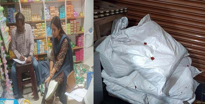 निरीक्षण के दौरान फर्म मेसर्स मनभावन एजेंसी एवं फर्म मेसर्स हरीश जनरल स्टोर, गंजपारा, महासमुंद की जांच की गई. मेसर्स मनभावन एजेंसी से 08 बोरी ‘पान पसंद’ (कुल 276 पैकेट) गुटखा जब्त किया गया, वहीं मेसर्स हरीश जनरल स्टोर से 01 बोरी ‘पान पसंद’ गुटखा अभिगृहित किया गया. इस प्रकार कुल 09 बोरी सामग्री जब्त की गई.
