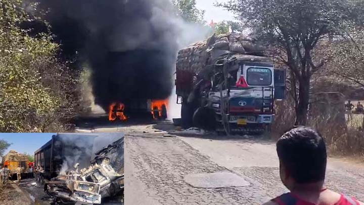 दो ट्रकों के बीच भीषण टक्कर : चालक केबिन में जिंदा जलकर मौत, दूसरा गंभीर घायल