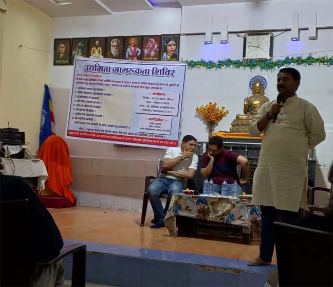 राजनांदगांव- गत रविवार को स्थानीय डॉ. आम्बेडकर सांस्कृतिक भवन भरकापारा में उद्यमिता जागरूकता शिविर का सफल आयोजन किया गया. कार्यक्रम के मुख्य अतिथि संजय गजघाटे अपर संचालक उद्योग संचालनालय रायपुर थे . कार्यक्रम में सर्वप्रथम बी. पी. वासनिक सेवानिवृत्त महाप्रबंधक जिला व्यापार एवं उद्योग केन्द्र राजनांदगांव द्वारा उद्यमिता जागरूकता शिविर के उद्देश्यों की जानकारी देते हुए एक सफल उद्यमी के गुणों तथा उद्यमिता की परिभाषा, वित्तीय साक्षरता और निवेश के संबंध में जानकारी दी गई. शेखर मेश्राम डी. आर. पी. जिला व्यापार एवं उद्योग केन्द्र राजनांदगांव द्वारा प्रधानमंत्री रोजगार सृजन कार्यक्रम एवं सूक्ष्म खाद्य उन्नयन योजना की जानकारी प्रदान की गई. रायपुर से पहुँचे बैंक अधिकारी मंडलोई प्रबंधक द्वारा बैंक ऋण की प्रक्रिया, मार्जिन मनी योजना की जानकारी तथा बैंक गॉरंटी आदि योजना की जानकारी दी गई. कार्यक्रम के मुख्य अतिथि गजघाटे अपर संचालक द्वारा शासन द्वारा शुरू की गई स्टार्टअप योजना की जानकारी प्रदान की गई कि कैसे युवा साथी शासन के साथ मिलकर अपना व्यवसाय, उद्योग प्रारंभ कर सकते हैं. उन्होनें उबेर, ओला एवं अमेजन को स्टार्टअप का अच्छा उदाहरण बताया. उन्होनें डॉ. आम्बेडकर के संदेशों का उदाहरण देते हुए कहा कि बाबा साहब के शिक्षित बनो नारे का आशय लोगों ने सर्टिफिकेशन, डिग्री को ही लेना समझ लिया है. मुख्य अतिथि ने सरकार द्वारा चलाई गई विभिन्न योजनाओं की जानकारी देते हुए बताया कि युवा साथी सही रोजगार, उद्योग का चयन कर युवा उद्यमी बनने के साथ ही और भी लोगों को रोजगार प्रदान कर सकते हैं. उन्होनें एक्सपोर्ट (निर्यात ) योजना की विस्तृत जानकारी प्रदान की तथा कहा कि मान्यता प्राप्त बैंकों से ही बैंक ऋण प्राप्त किया जा सकता है.