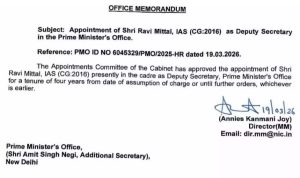IAS रवि मित्तल को मिली अहम जिम्मेदारी, प्रधानमंत्री कार्यालय में नियुक्त हुए उप सचिव