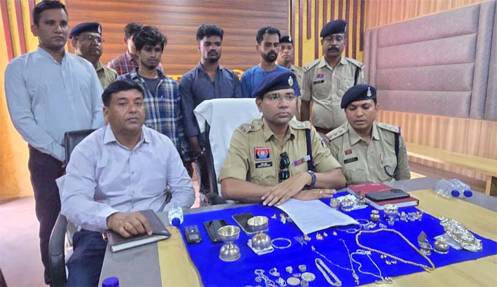 02 नग चांदी का दिया, 01 बड़ा एवं 01 छोटा चांदी का कटोरा, 06 नग चांदी की बिछिया, 05 नग चांदी की बिछिया, 07 जोड़ी चांदी के कान के टॉप्स, 04 नग चांदी के कान के टॉप्स, 02 नग चांदी का कड़ा, चांदी एवं काले मोती का बाजूबंद, 01 नग चांदी का छोटा लड्डू, 01 जोड़ी सोने के टॉप्स, 02 जोड़ी सोने के लॉकेट, कुल बरामद संपत्ति की अनुमानित कीमत लगभग 05 लाख रुपये है. घटना में शामिल चाकू को भी आरोपियों से जप्त किया गया है घटना में शामिल अन्य 02 आरोपियों की गिरफ्तारी के लिए पुलिस टीम सक्रिय रूप से प्रयासरत है.