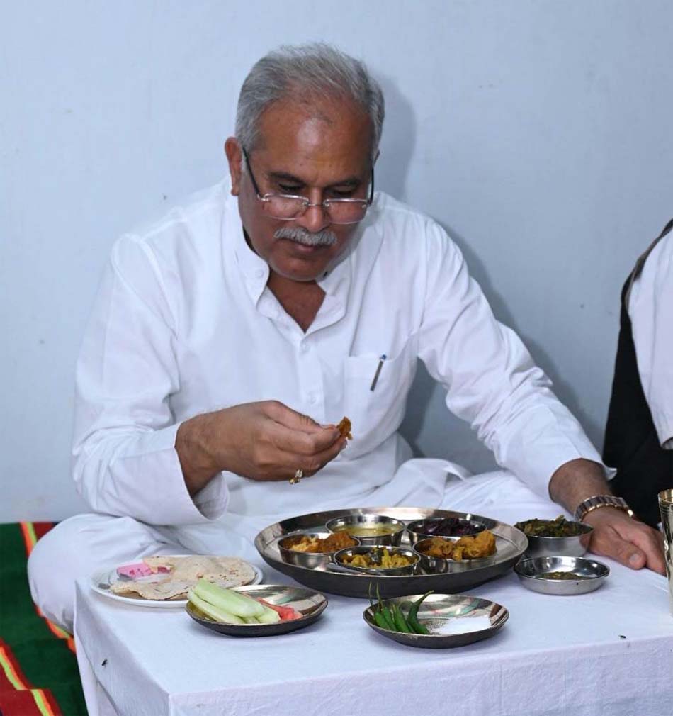 मुख्यमंत्री ने देवांगन परिवार के सदस्यों द्वारा सादगी के साथ परोसे गए स्वादिष्ट छत्तीसगढ़ी भोजन का स्वाद लिया. देवांगन परिवार ने पूरी आत्मीयता के साथ मुख्यमंत्री को भोजन में चावल, दाल, रोटी के साथ कुसुम भाजी, लाल और सेमी की मिक्स सब्जी, मुनगा, आलू-बड़ी की सब्जी, भांटा, गोभी मटर की सब्जी, जिमी कांदा पापड़, सलाद और विशेष रुप से चिरपोटी पताल की चटनी भी परोसा. गृह स्वामी झंगलू देवांगन और उनकी पत्नी बेसाखीन बाई मुख्यमंत्री जी के उनके घर आकर भोजन करने पर गदगद हो रहे थे. मुख्यमंत्री ने स्वादिष्ट छत्तीसगढ़ी भोजन के लिए श्री देवांगन एवं उनके परिजनों को उपहार भेंटकर धन्यवाद दिया .