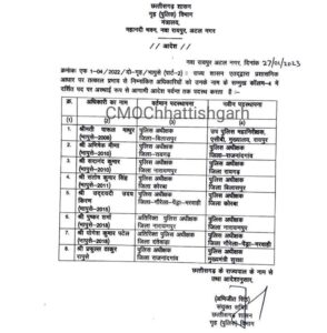 वहीं भारतीय प्रशासनिक सेवा के अधिकारियों में जांजगीर कलेक्टर आईएएस तारण प्रकाश सिन्हा को अब रायगढ़ की जिम्मेदारी दी गई है. वही रायगढ़ कलेक्टर रानू साहू को कृषि विभाग का संयुक्त सचिव बनाया गया हैं एवं रानू साहू की जगह तारण प्रकाश सिन्हा रायगढ़ कलेक्टर बने.