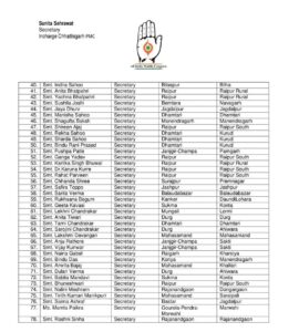 दुर्ग ग्रामीण से सरिता परगनिया को उपाध्यक्ष का पद मिला है, कल्पना देशमुख को उपाध्यक्ष का पद मिला है, दिनेश चतुर्वेदी को महासचिव का पद मिला है, अनीता तिवारी को सचिव का पद मिला है, सरोजनी चंद्राकर को सचिव का पद मिला है, संध्या वर्मा को सचिव का पद मिला है, सत्यवती साहू को सचिव का पद मिला है, दुलारी वर्मा को सचिव का पद मिला है.