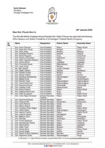 छत्तीसगढ़ राष्ट्रीय महिला कांग्रेस अध्यक्ष नीता डिसूजा एंव छत्तीसगढ़ प्रभारी सुनीता सहरावत द्वारा अनुशंशित प्रदेश कार्यकारिणी की सूची प्रदेश महिला कांग्रेस को अध्यक्षा व सांसद फूलो नेताम के निर्देश पर जारी की गई है. कार्यालय प्रभारी उषा रंजन श्रीवास्तव ने समस्त नव नियुक्त प्रदेश पदाधिकारी व जिला अध्यक्ष को आदेश की जानकारी के पश्चात अपना पद भार ग्रहण कर पार्टी के नियमो के तहत अनुशासन में रहकर कार्य करने निर्देशित किया है.
