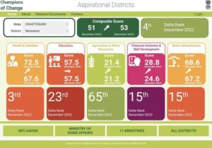 रायपुर- भारत सरकार के नीति आयोग की ओर से आकांक्षी जिलों को लेकर रिपोर्ट जारी की जाती है. इसी कड़ी में दिसम्बर 2022 के लिए जारी की गयी चैम्पियन ऑफ चेंज डेल्टा रैंकिंग में छत्तीसगढ़ के नारायणपुर जिले का परफॉर्मेंस बेहतर रहा है. देश में घोषित 112 आकांक्षी जिलों में से ओवरऑल परफॉर्मेंस श्रेणी में शीर्ष पांच जिलों में छत्तीसगढ़ के आकांक्षी जिलों में शामिल नारायणपुर जिला चौथे स्थान पर है. वहीं स्वास्थ्य और पोषण श्रेणी में नारायणपुर जिले का स्थान तीसरा है.